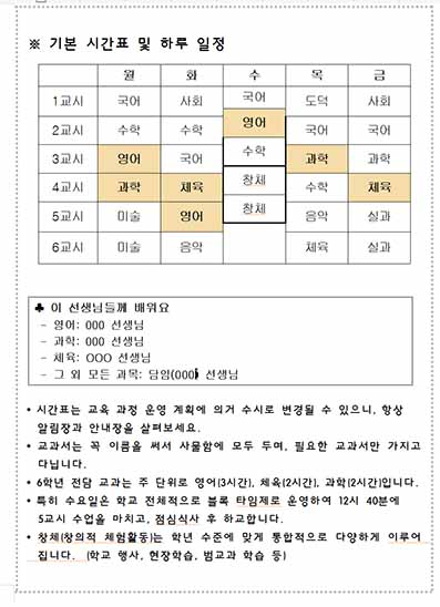 최근에는 시간표보다는 주간학습 위주라, 큰 의미는 없지만.. 그래도 큰 틀의 시간표는 있는 것을 학생들은 더 편하게 생각해서 항상 넣었습니다! (그래서 바뀔 수 있다는 말을 꼭 넣었습니다!)