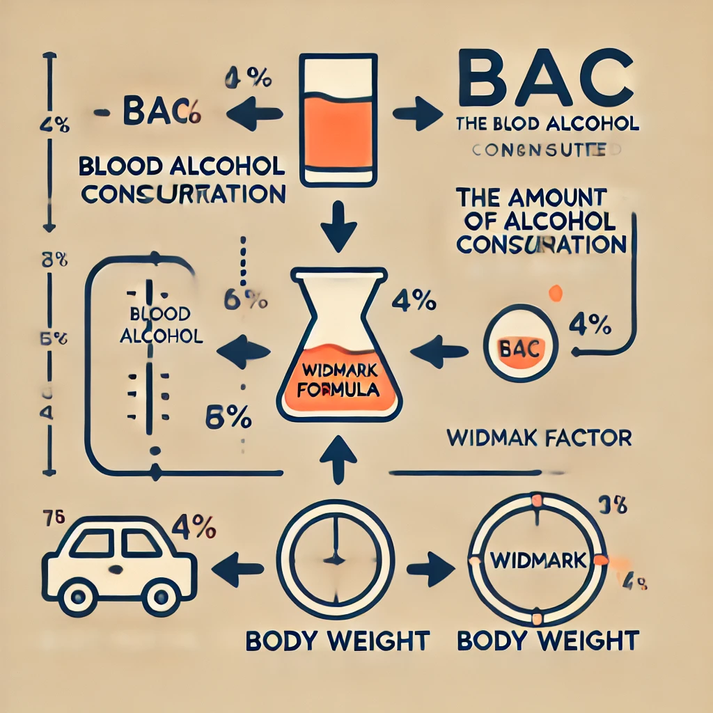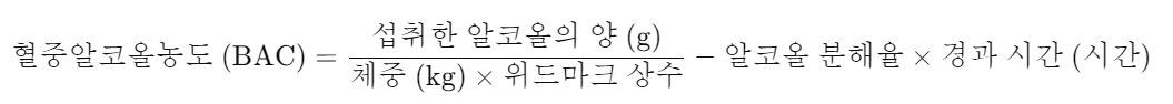 이 공식은 “얼마나 많은 알코올을 섭취했는지”, “체중은 얼마인지”, “얼마나 시간이 지났는지” 등을 바탕으로 대략적인 BAC 값을 계산하는 방법입니다.