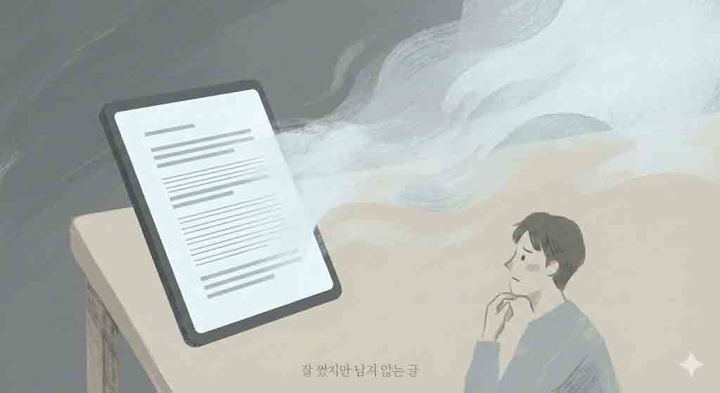 덕분에 오류는 적지만, 글의 중심이 흐릿해지는 결과가 나오기 쉽습니다. 정보는 충분한데 무엇을 말하려는 글인지는 선명하지 않은 경우가 많습니다. 그래서  AI글이 설명은 잘하지만, 주장처럼 느껴지지 않는 가장 큰 이유입니다.