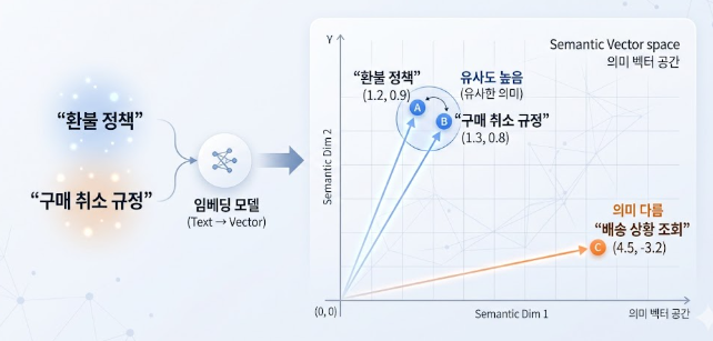 임베딩은 텍스트를 숫자로 바꿔서 의미를 좌표처럼 표현하는 기술입니다. 예를 들어 "환불 정책"과 "구매 취소 규정"은 단어는 다르지만 의미가 비슷합니다. 임베딩을 쓰면 이런 문장들이 서로 가까운 위치에 놓여서, 의미 기반으로 관련 문서를 정확하게 찾을 수 있습니다.
