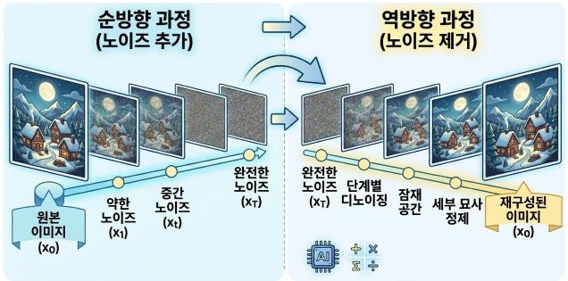 Diffusion 모델은 그림을 처음부터 그리는 것이 아니라 그림을 일부러 망가뜨렸다가 복원하는 과정을 학습합니다.