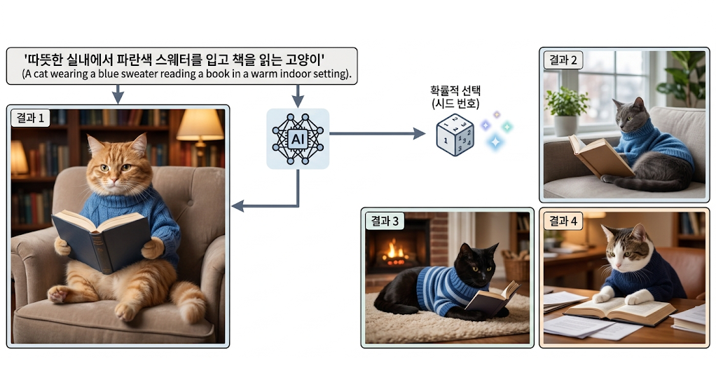 같은 프롬프트를 넣어도 이미지가 매번 조금씩 다른지 이유가 바로 이 것입니다.