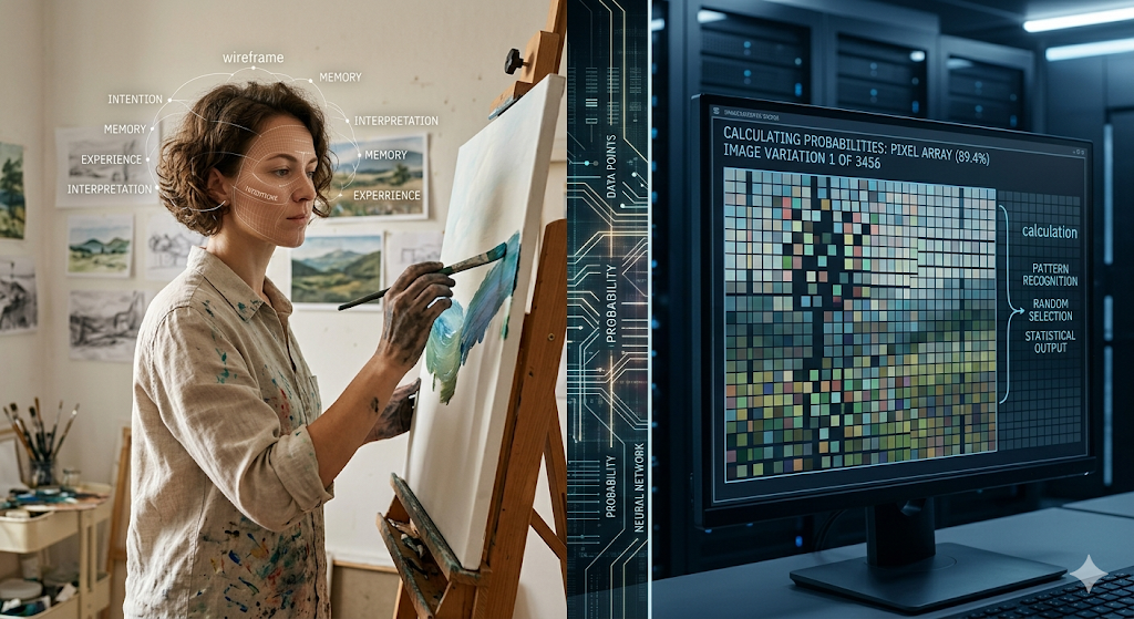 반면 AI는 스스로 의도를 가지지도 않고 상상을 하지도 않습니다. AI가 하는 일은 데이터에서 학습된 패턴을 바탕으로 가능한 이미지를 계산하는 것입니다. 하나의 정답이 아니라 가능한 결과 중 하나를 뽑아내는 것입니다. AI가 만든 이미지는 픽셀의 배열, 확률 계산의 결과일 뿐입니다.