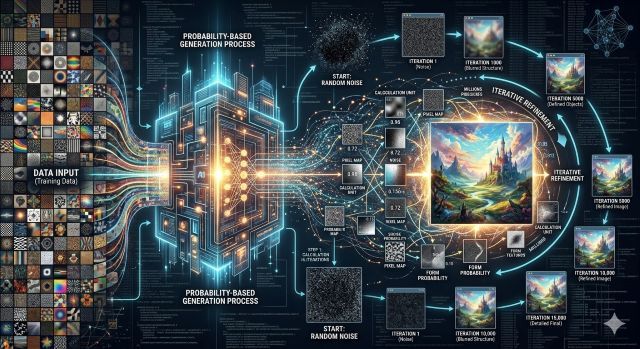 하지만 실제 AI가 그림을 그리는 방식은 다릅니다. AI는 상상해서 그리지 않습니다. 사실 “그린다”라는 표현 자체가 올바른 표현이 아닙니다. AI가 그림을 그리는 방식은 확률을 계산해서 그리는 방식입니다. 그것도 한 번만 확률을 계산하는 것이 아니라 수 없이 많은 계산을 반복해서 만듭니다.