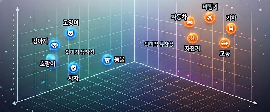 그런데 여기서 자세히 보면 중요한 특징이 있습니다. 비슷한 의미를 가진 단어들은 벡터 공간에서 서로 가까운 위치에 놓입니다.