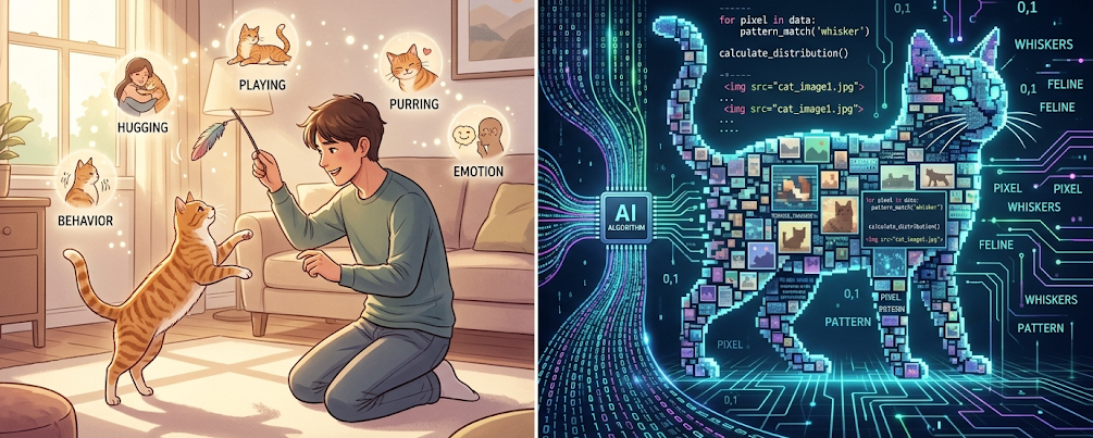 반면에, AI에게 고양이라는 개념은 수많은 이미지와 텍스트 데이터 속에서 반복적으로 등장한 패턴의 집합일 따름입니다. 즉, 고양이를 아는 것이 아니라 고양이와 관련된 픽셀 단어와 단어 패턴의 분포를 알고 있는 것입니다.