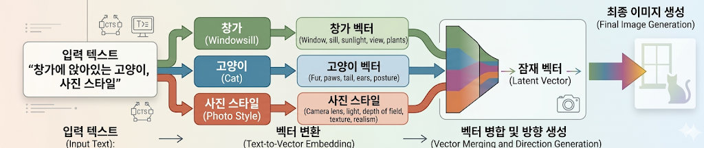 이렇게 AI는 텍스트와 이미지 정보를 모두 벡터 형태로 바꿔서 계산합니다.